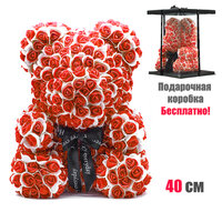 Мишка из роз 40 см Бело-красный в Подарочной коробке