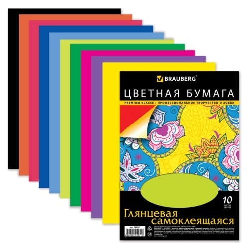 Цветная бумага самоклеящаяся мелованная BRAUBERG, A4, 10 л., 10 цв.