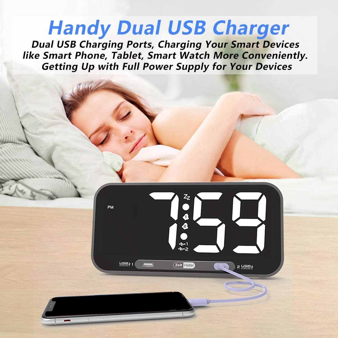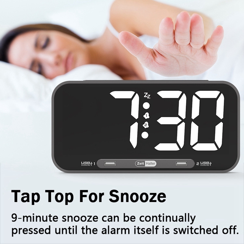 Большой двойной будильник, светодиодный цифровой дисплей-2, USB-порт для зарядного устройства, белый