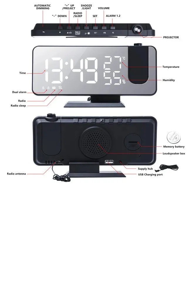 Часы - Будильник с проекцией времени на потолок и стену, термометром и уровнем влажности