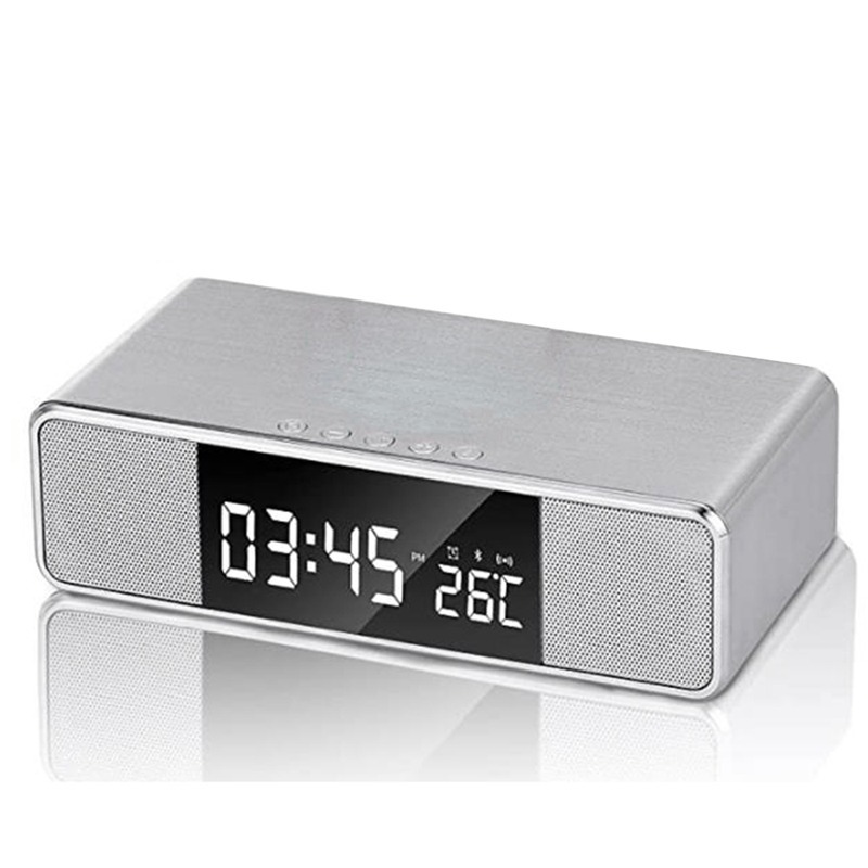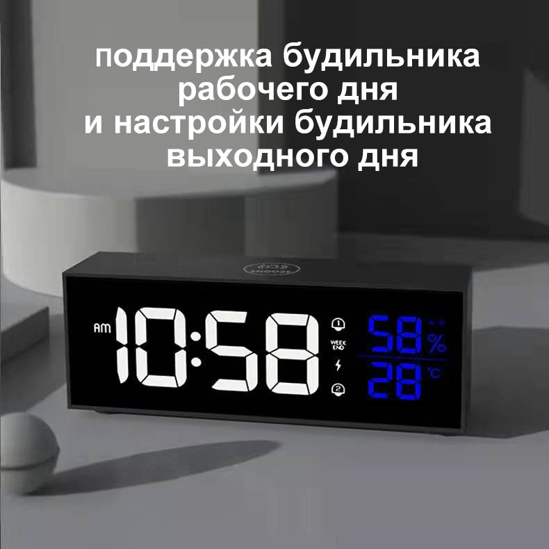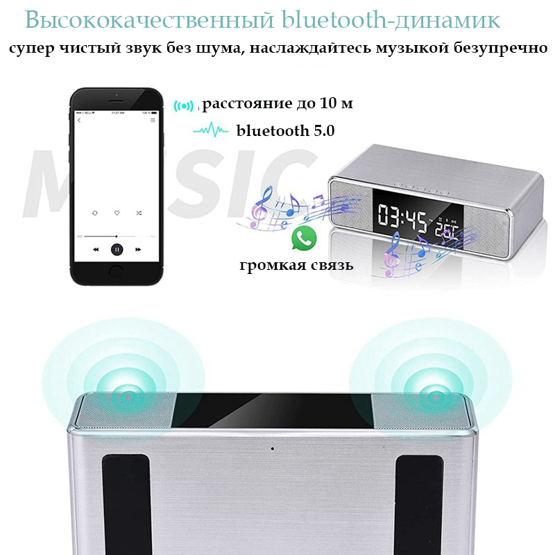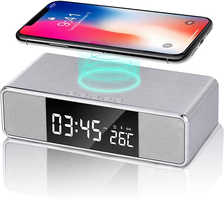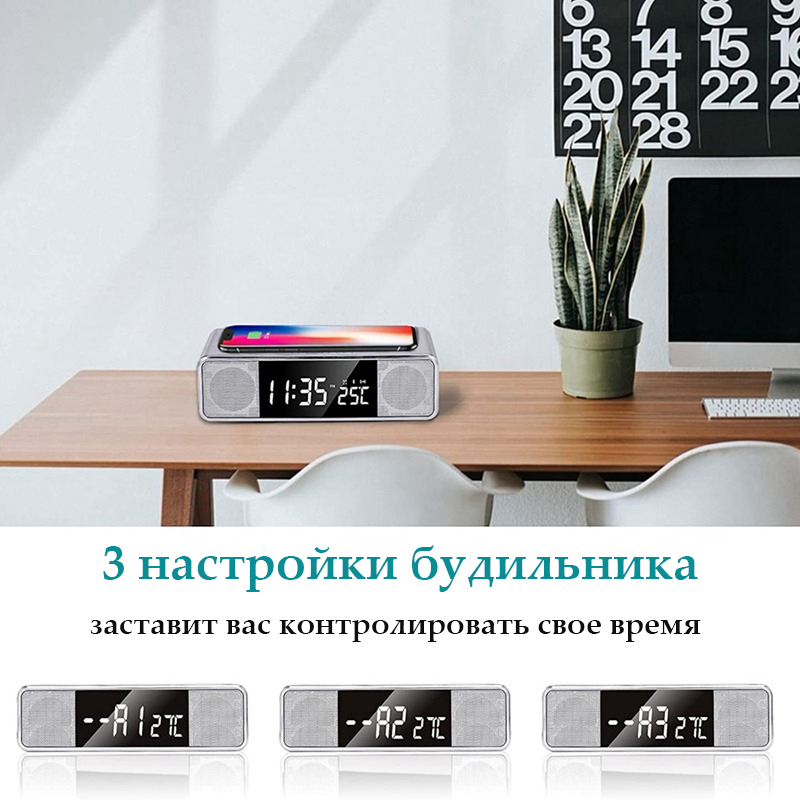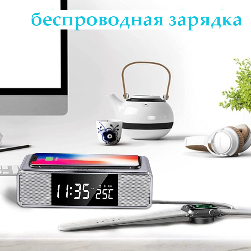 Часы будильник с быстрой беспроводной зарядкой телефона, BT, динамик и FM радио