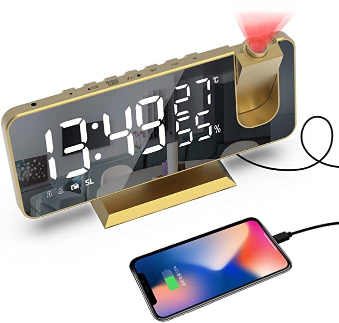 Часы с проекцией времени на потолок/ гигрометр/ будильник/ радио, черные