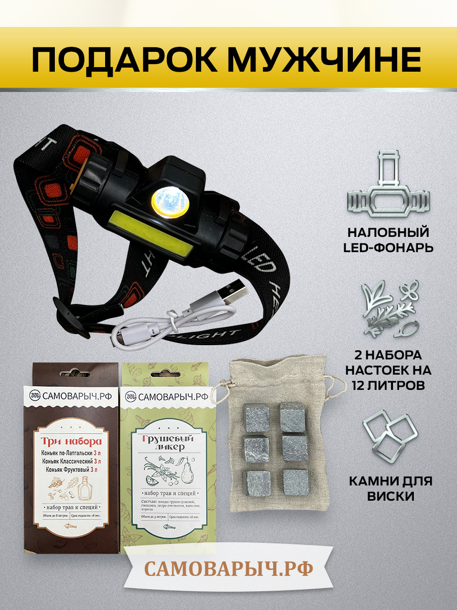 Подарок мужчине - набор трав и специй, налобный LED фонарик, камни для виски