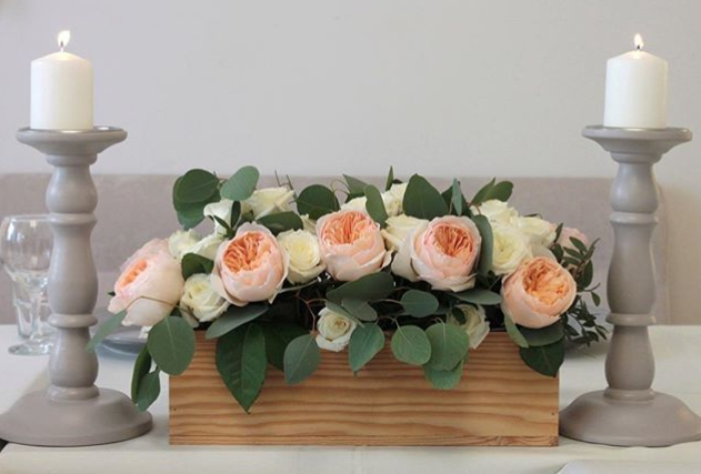 Композиция из цветов микс с пионовидными розами, белыми розами и эвкалиптом.