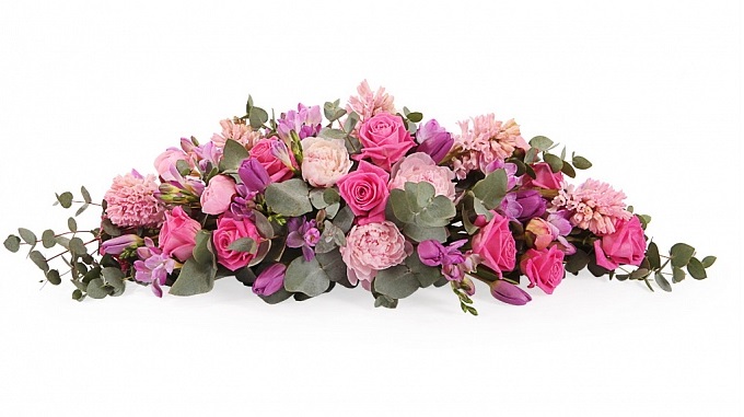 Гирлянда из цветов микс с розами, пионами, гиацинтами, тюльпанами, фрезией и эвкалиптом.