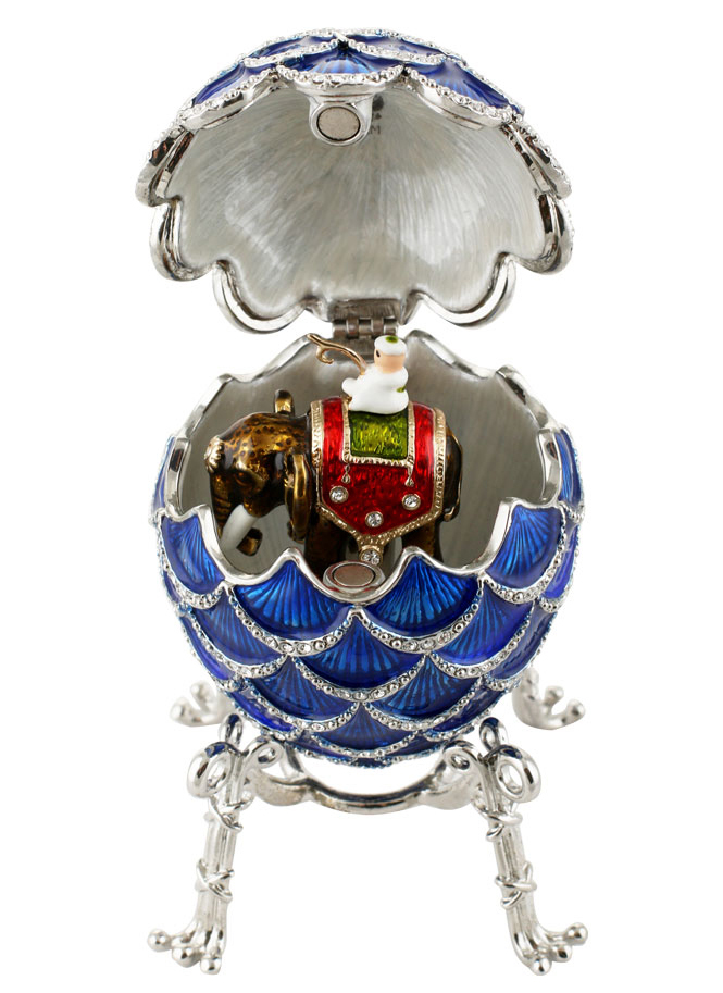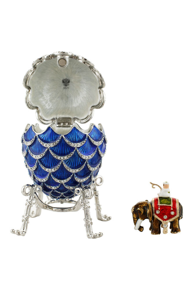 Яйцо-шкатулка в стиле Фаберже Шишка со слоном, музыкальное, синее, 12см