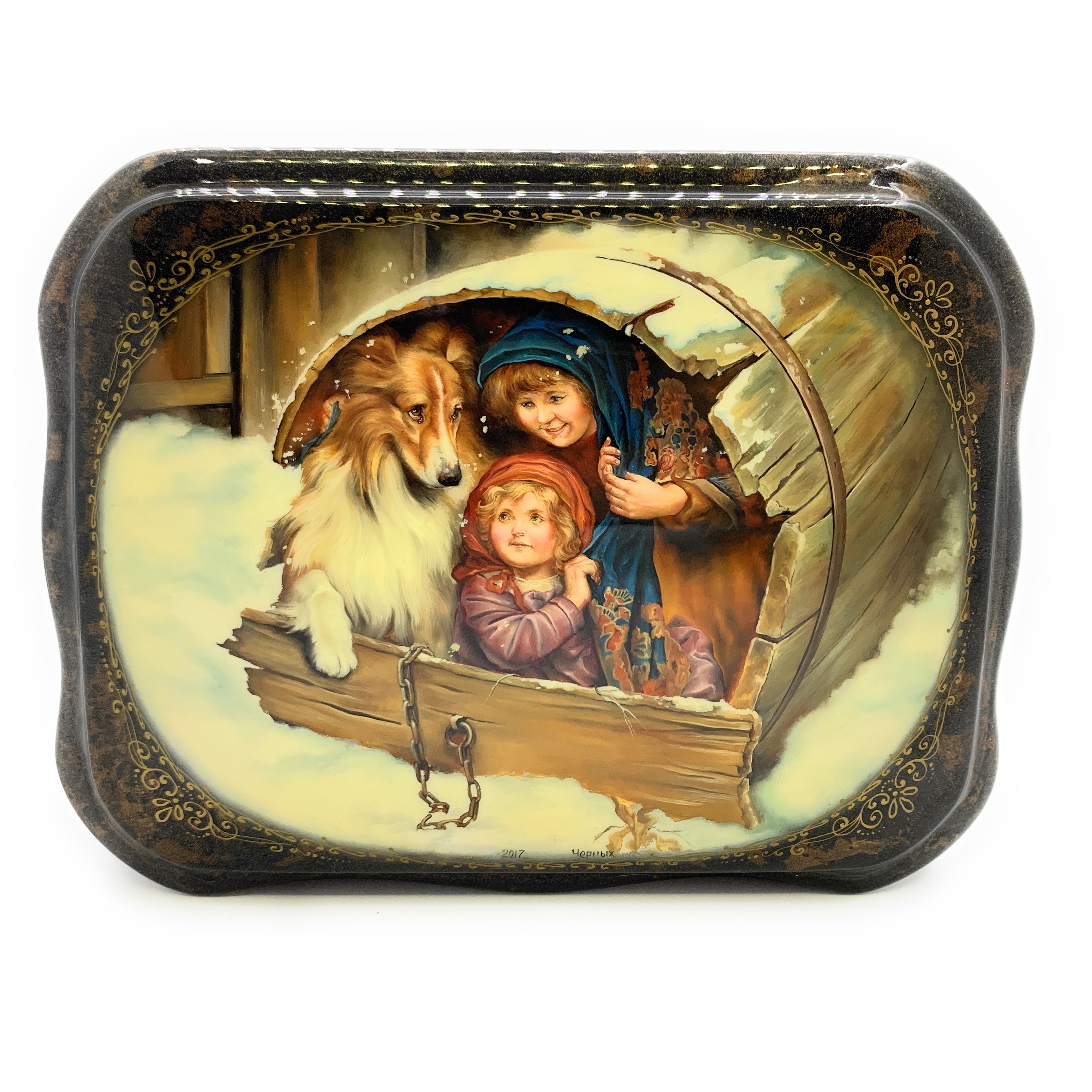 Шкатулка с лаковой миниатюрой Зимний пейзаж, снегири / Ручная роспись
