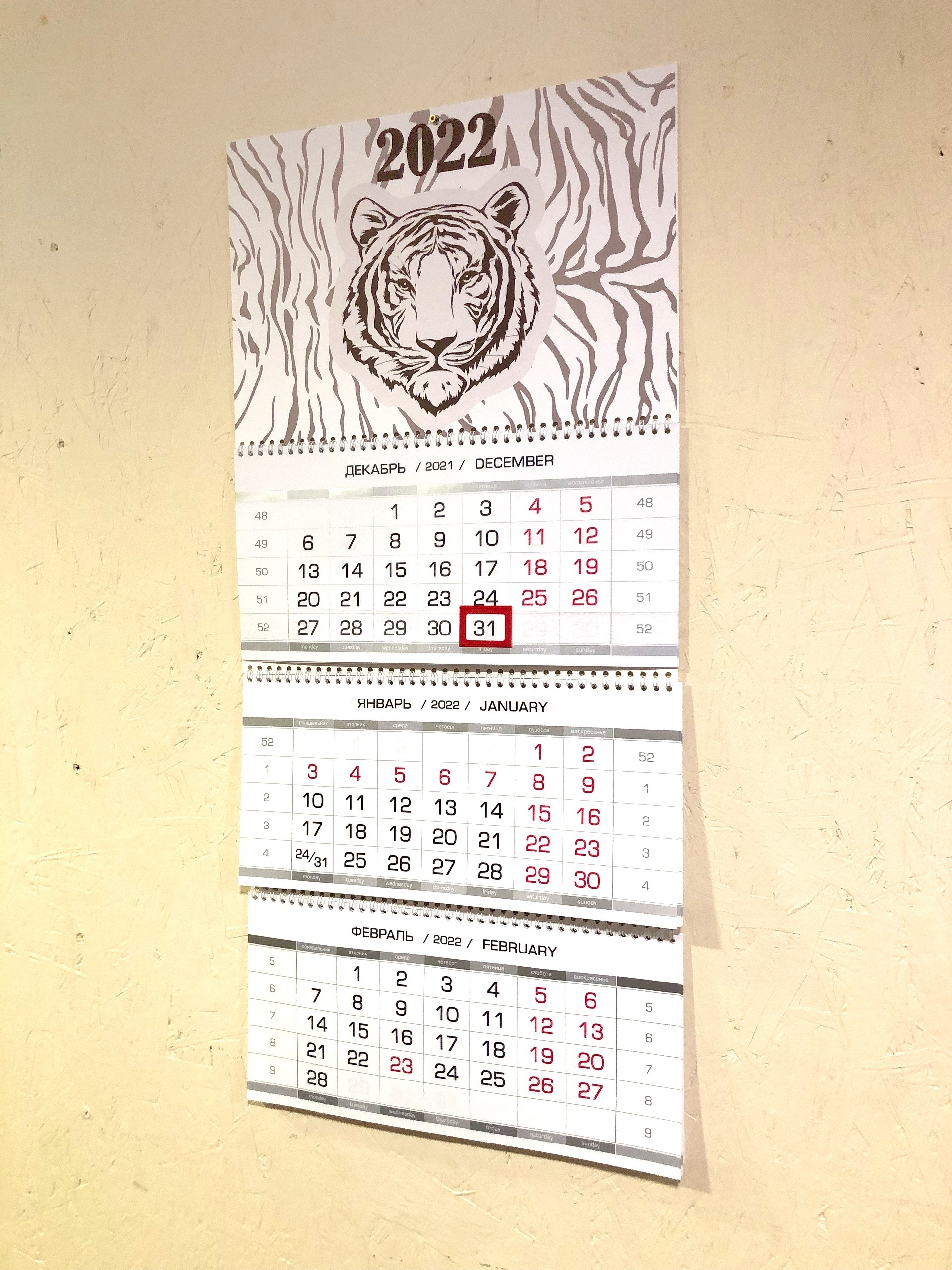 Календарь квартальный трехблочный 2022 год Тигр. Длина в развернутом виде - 73 см, ширина - 33.5 см.