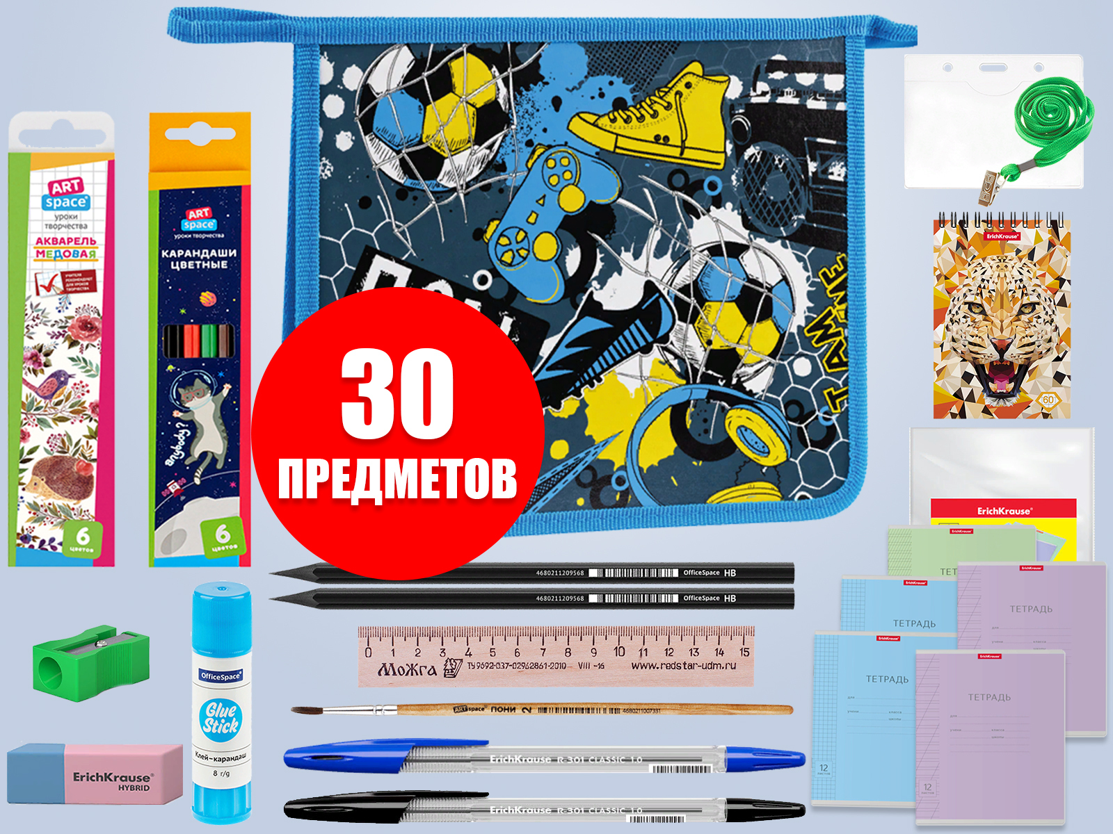 Набор первоклассника ОДИССЕЙ 30 предметов в пластиковой папке на молнии А5+ ВРЕМЯ ФУТБОЛА