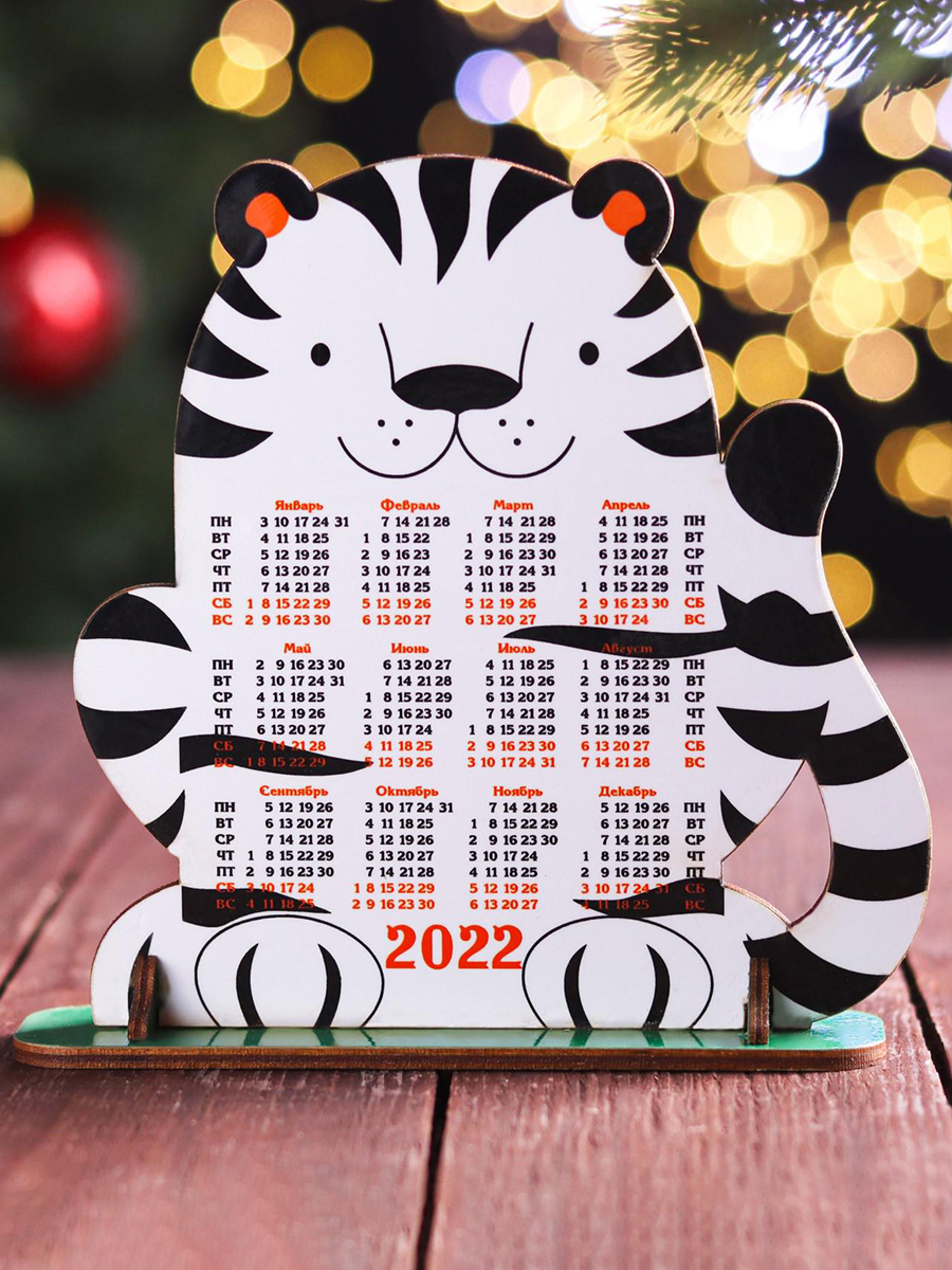 Календарь "Тигр сидит", ламинация, белый, дерево, 14,4х14,7 см
