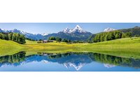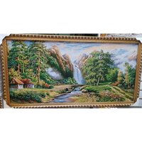 Гобелен "Водопад, горы, река, цветы", 60x120 см. Картина нитями в золотом багете (рамка)