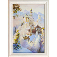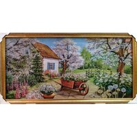 Гобелен "Домик, тележка, цветы, одуванчики", 60x120 см. Картина нитями в золотом багете (рамка)