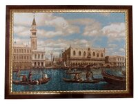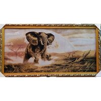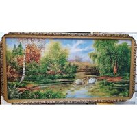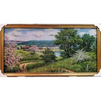 Гобелен "Цветы, озеро, дорожка, домик", 60x120 см. Картина нитями в золотом багете (рамка)