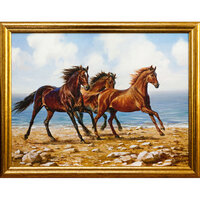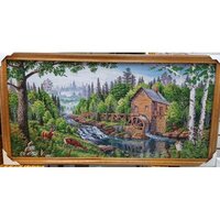 Гобелен "Олени, домик, река, березы", 60x120 см. Картина нитями в золотом багете (рамка)