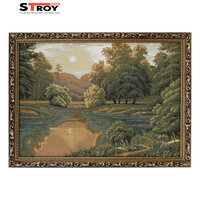 Гобелен "Лодка, река, церковь, березы", 60x120 см. Картина нитями в золотом багете (рамка)