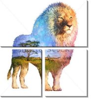Модульная картина на холсте, Двойная экспозиция - лев и саванна