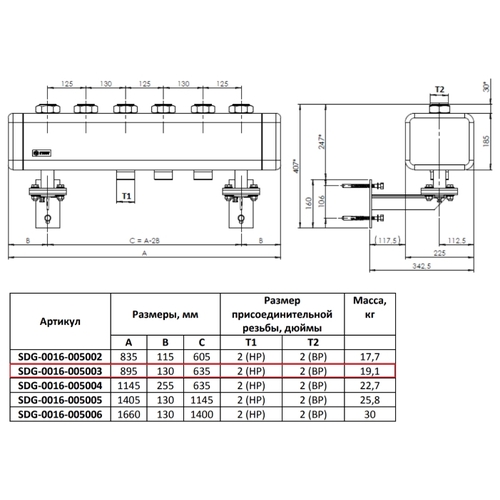 Коллекторная группа Tim (KBS5005) 1" ВР-ВР, 5 отводов 3/4", воздухоотводчик, сливной кран