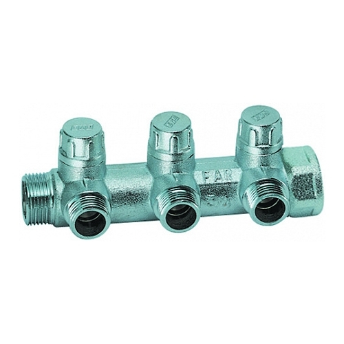 Коллектор проходной запорный FAR Multifar (3870 134) 1" ВР-НР, 3 отвода 3/4" евроконус