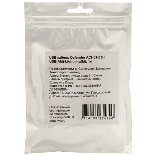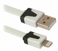 Кабель USB-Lightning Defender 87472, ACH01-03P USB(AM)-Lightning(M), 1м, белый, плоский
