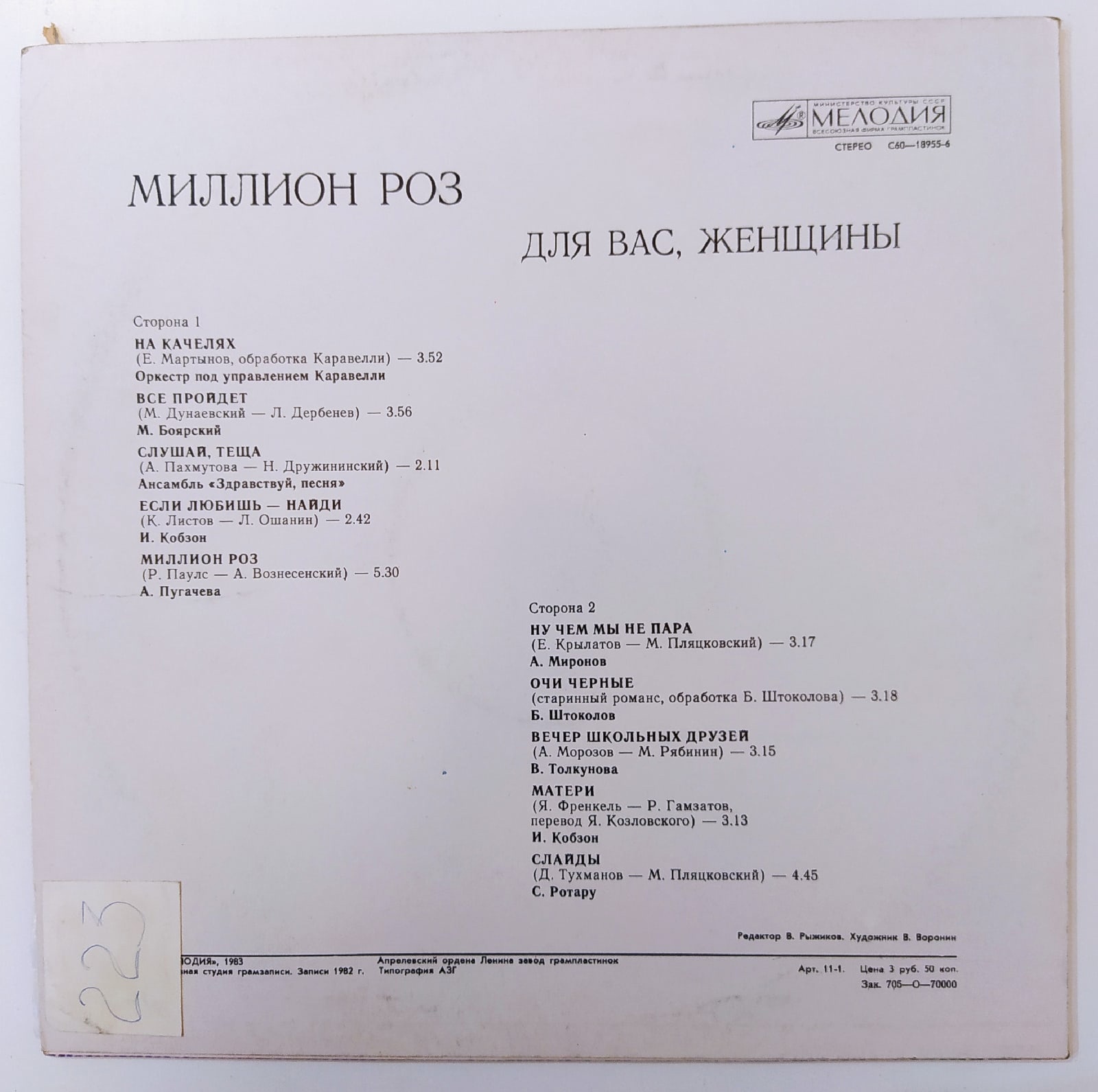 Виниловая пластинка винтажная Сборник Миллион Роз (Алла Пугачева)