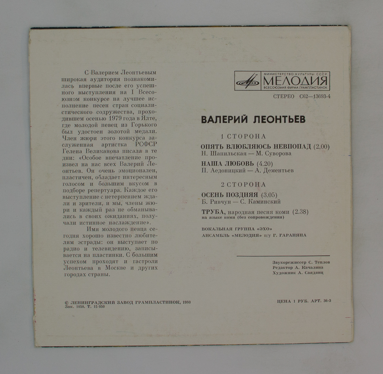 Виниловая пластинка Валерий Леонтьев - Опять влюбляюсь невпопад - 7' (миньон)