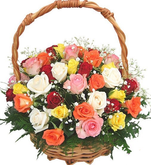 Букет в корзине цветы 51 шт. Композиция Корзина из Роз микс и гипсофилы 50 см. (Израиль)