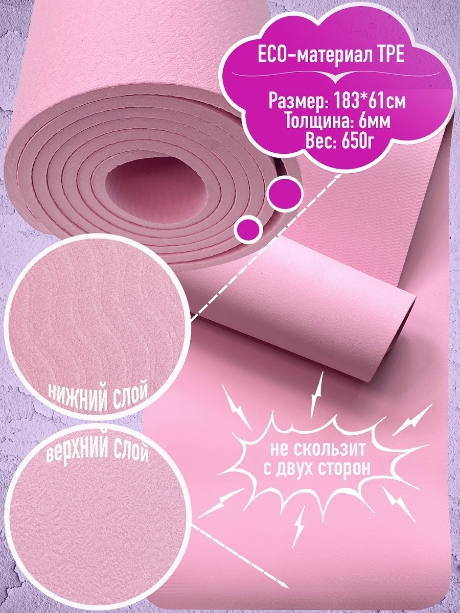 Коврик спортивный, для фитнеса и Йоги, Like, Sport, Mat, Yoga, Profi, TPE, 183x61x06, M-1, С Розовый