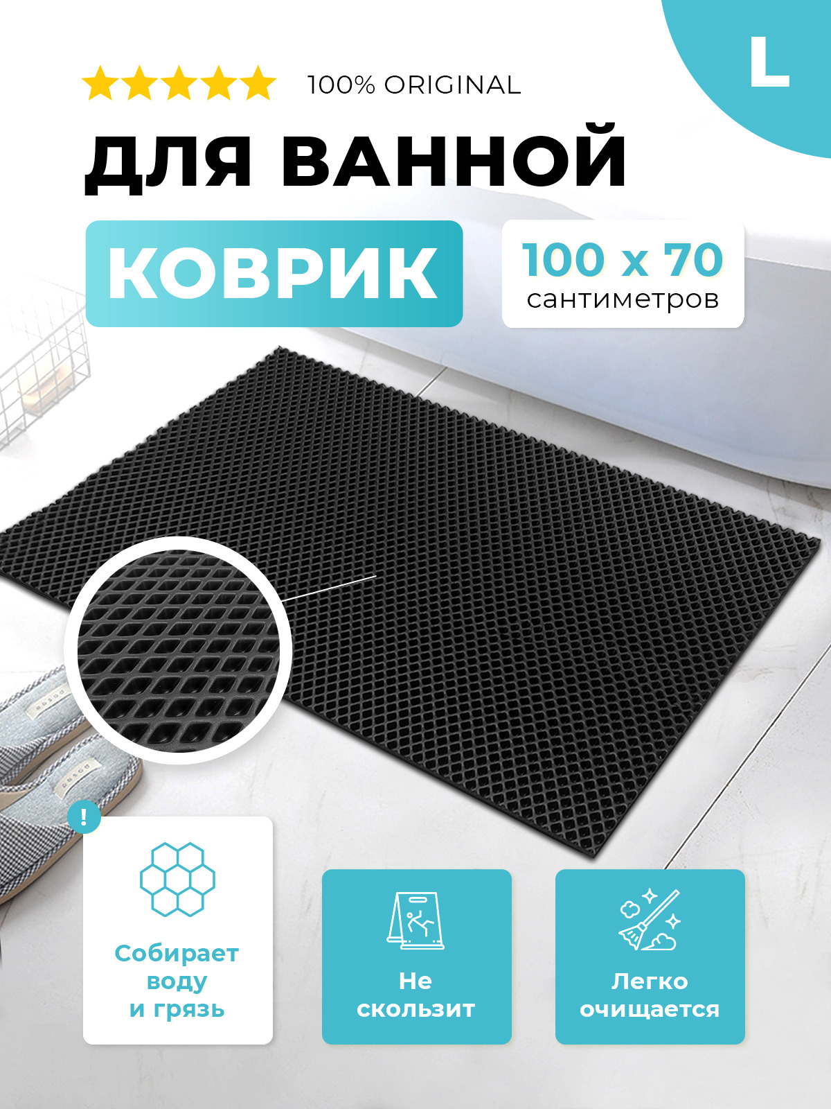 Коврик для ванны ЭВА черный, прямоугольный, размер L, 100 х 70 см