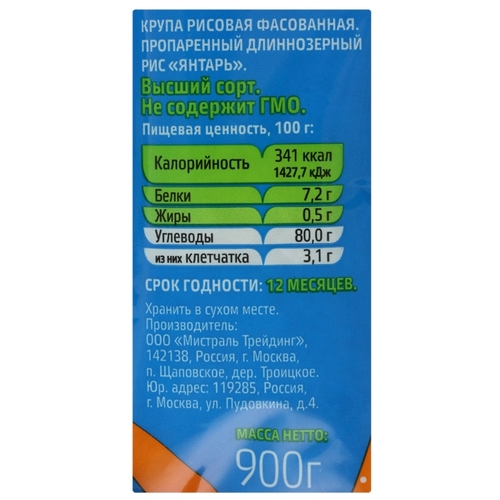 Рис Мистраль Янтарь пропаренный длиннозерный 900 г