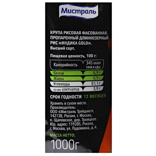 Рис Мистраль Индика пропаренный длиннозерный Gold 1 кг