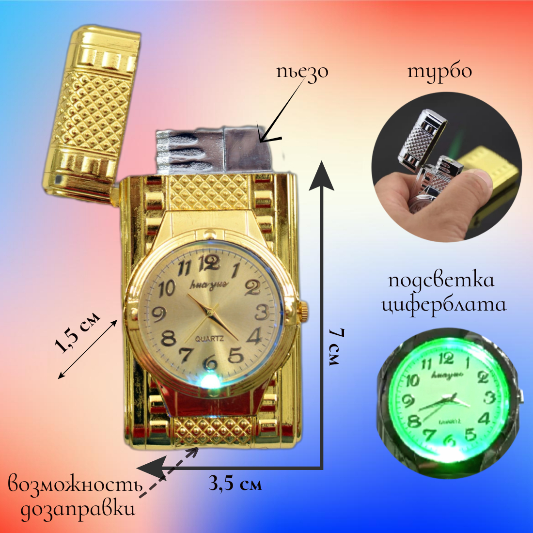 Зажигалка "Часы", 7х3,5х1,5 см / турбо, пъезозажигалка, газовая, с подсветкой, в подарок.