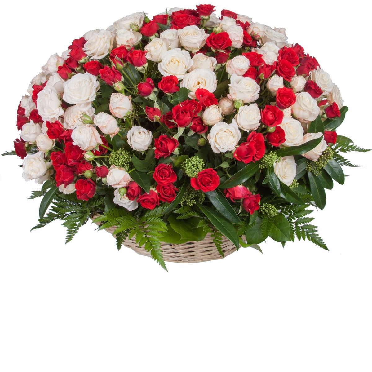 51 роза в корзинке. Авторская Корзина из белых и красных кустовых роз 51 шт. 50 см. (Голландия)