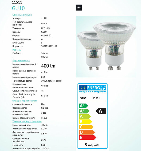 Лампа Eglo GU10 GU10 10Вт 3000K