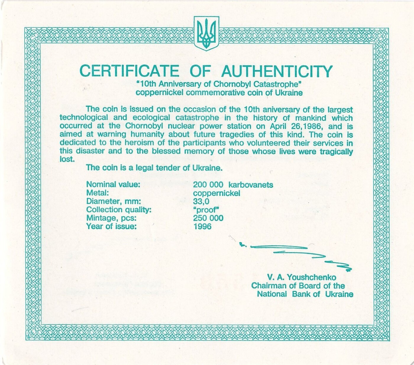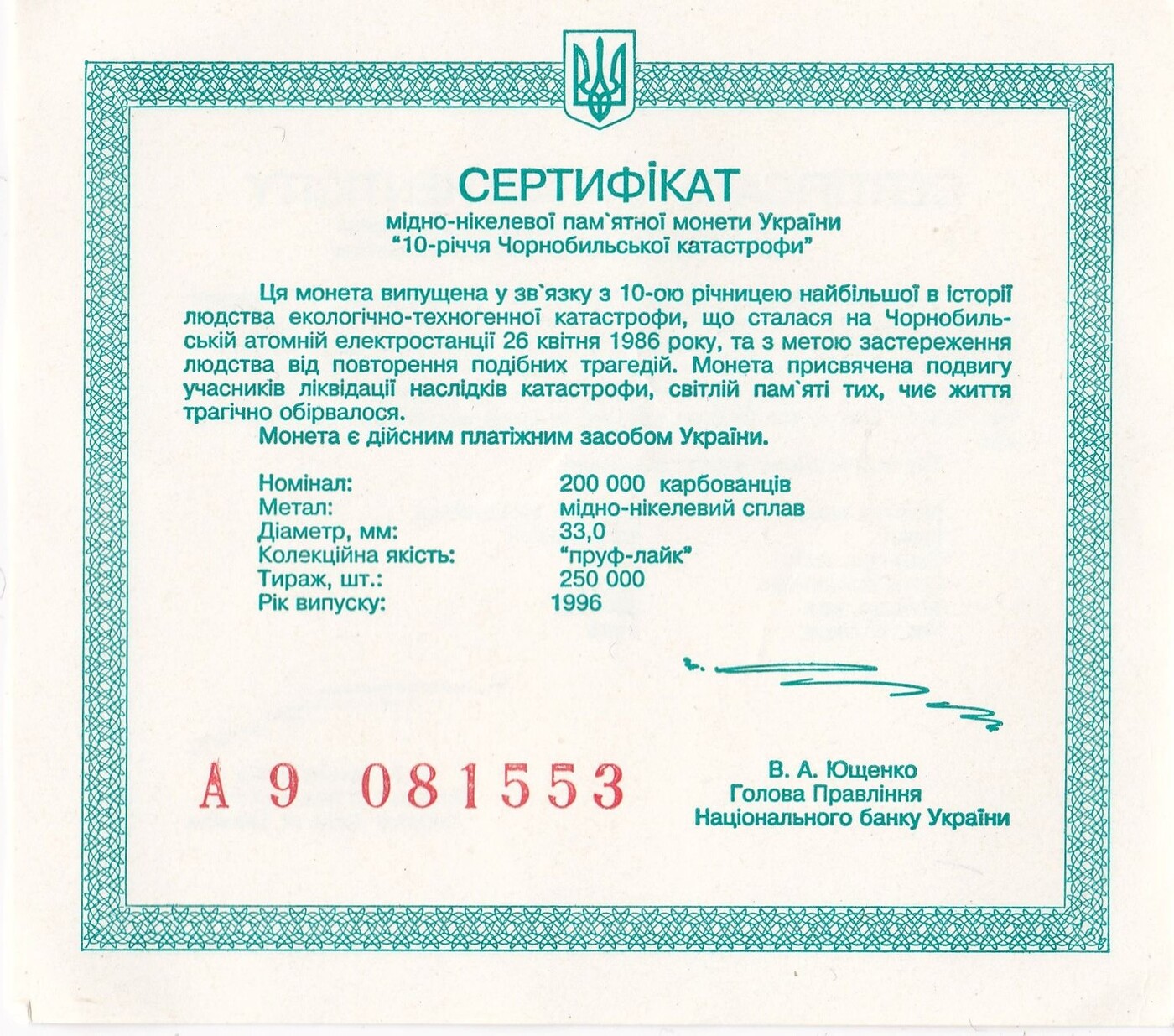 Монета номиналом 200000 карбованцев "10 лет Чернобыльской аварии" с сертификатом. Украина. 1996 год.