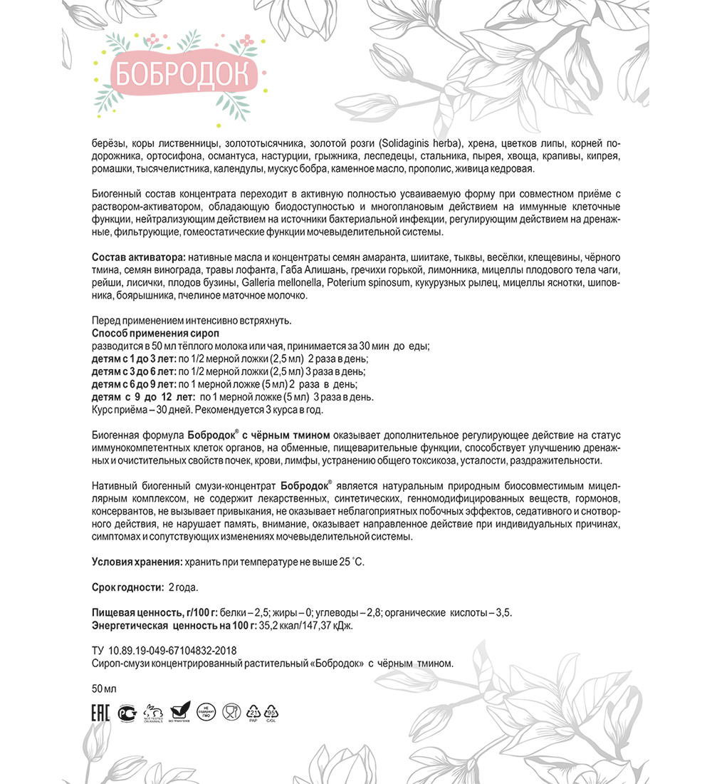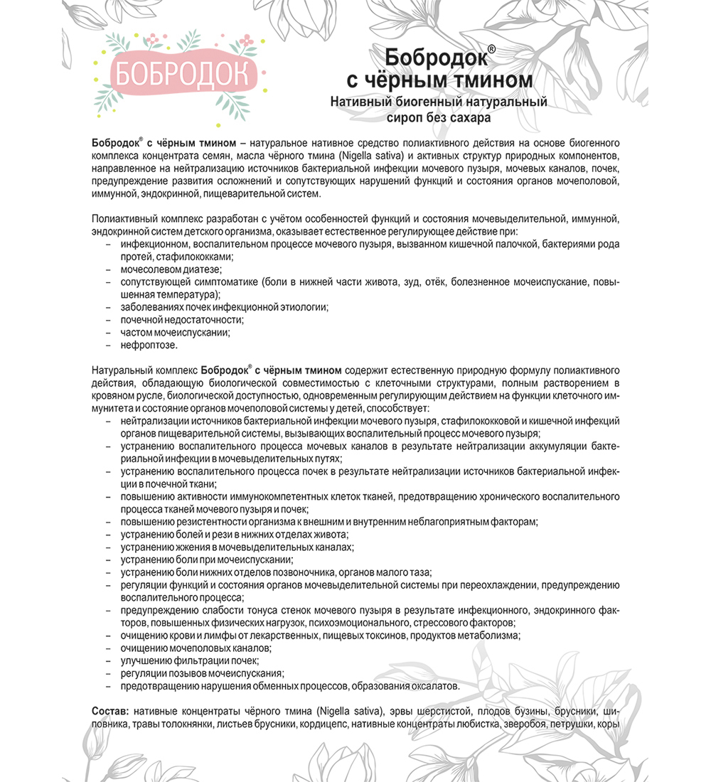 Сашера-МЕД Сироп ''Бобродок'' с чёрным тмином для мочеполовой системы