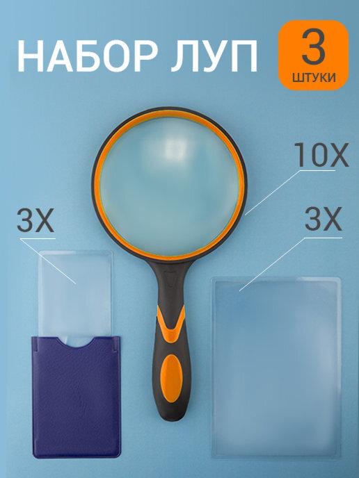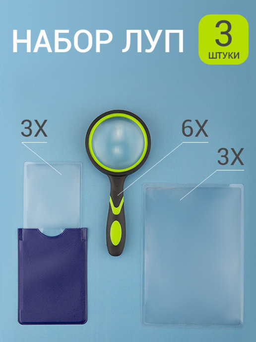 Лупа ручная стеклянная 50мм 6х + лупа плоская 3х + лупа "Мини" в футляре 3х / набор из трех луп