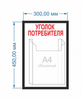 Уголок потребителя - размер 300х450 мм., карманы формат А4, объемный 1 шт (Белый фон, черные надписи - Рамка белая пластиковая )
