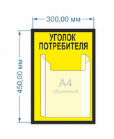 Уголок потребителя - размер 300х450 мм., карманы формат А4, объемный 1 шт (Желтый фон, черные элементы - Рамка черная пластиковая )