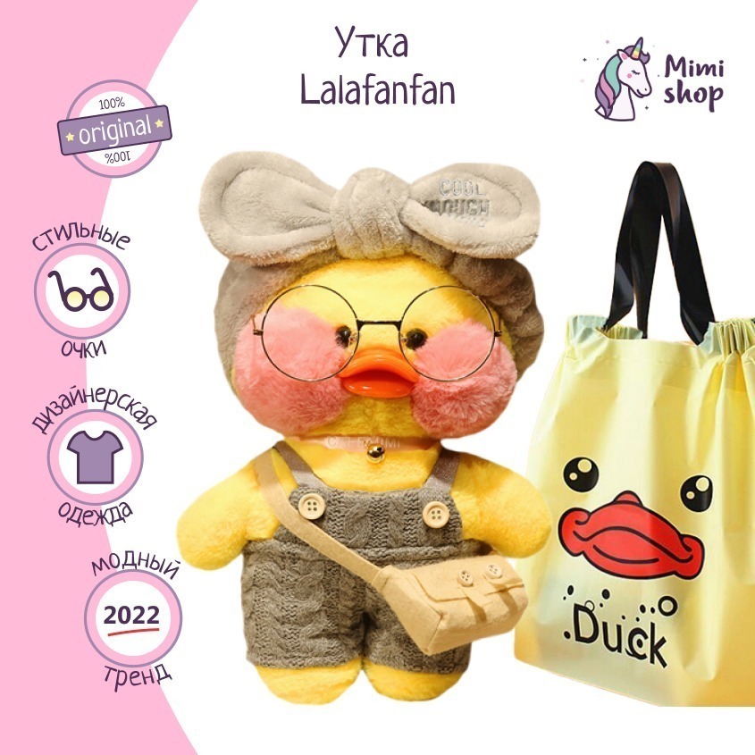 Мягкая игрушка утка Lalafanfan duck в сером комбинезоне и серым бантом, желтая. Уцененный товар