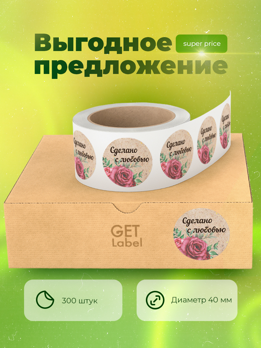Наклейки "Сделано с любовью", диаметр 40 мм, 300 штук.