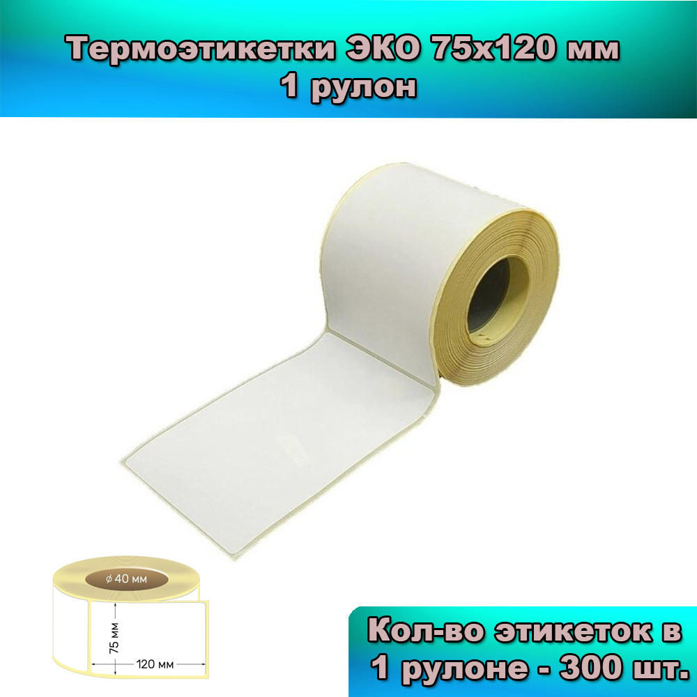 Термоэтикетки ЭКО 75х120 мм (300 шт в рулоне), самоклеящиеся, диаметр втулки 40 мм, 1 рулон