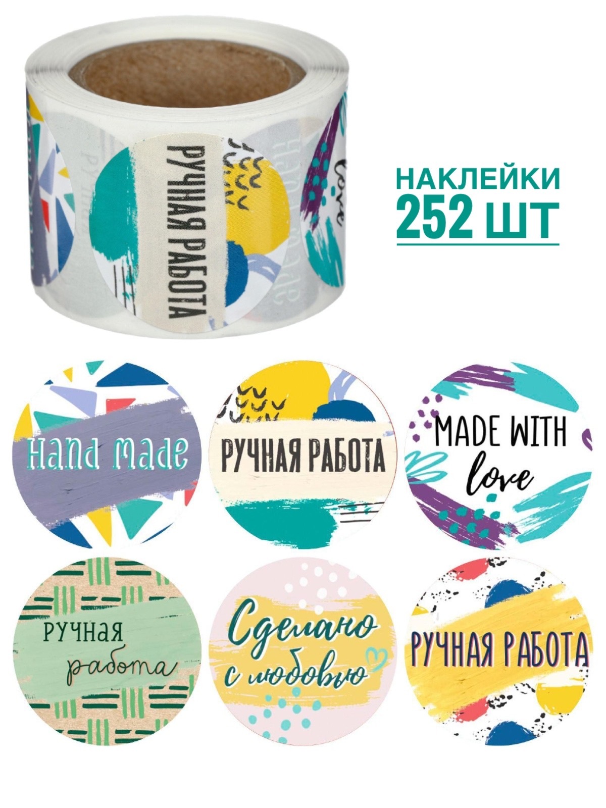 Наклейки "Ручная работа", "Сделано с любовью", "Hand made", 252 шт, наклейки круглые 4*4 см