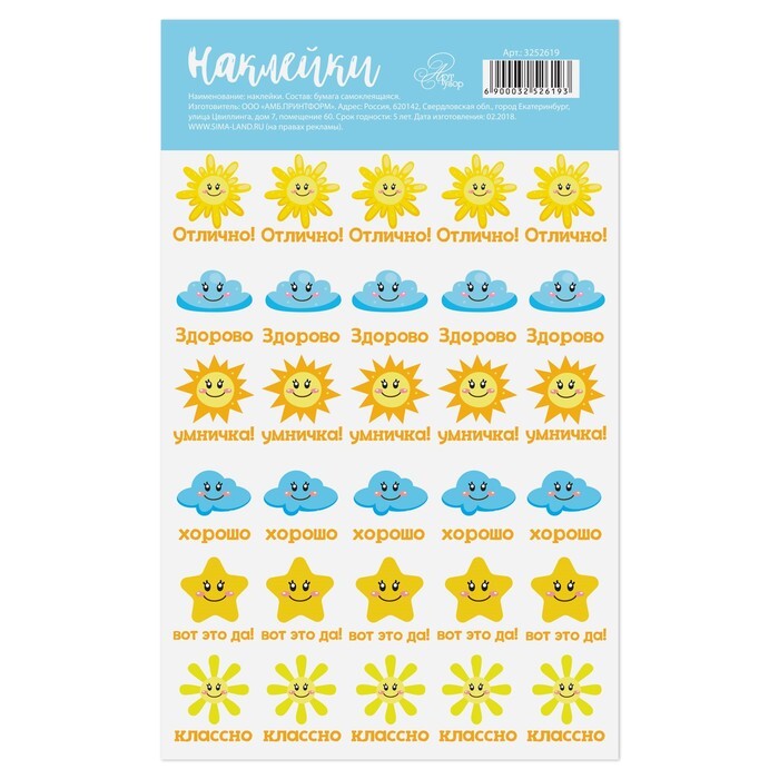 Комплект наклеек для поощрения детей (оценки), 5 листов, размер 153мм*92мм, артикул 88.829