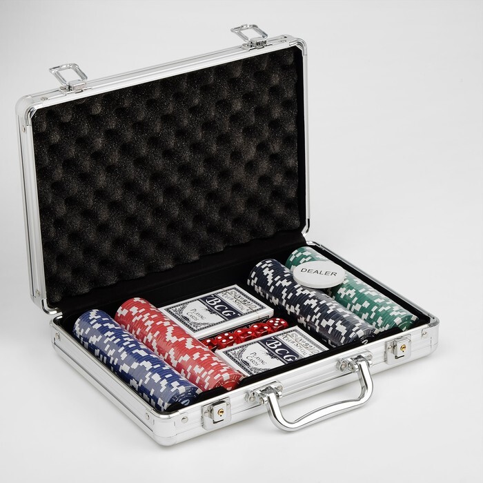 Покер в металлическом кейсе карты 2 колоды, фишки 200 шт, 5 кубиков, 20.5*29 см