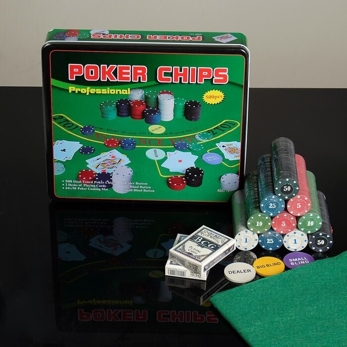 Покер в металлическом кейсе карты 2 колоды, фишки 500 шт без номинала, 5 кубиков, 20.5*56 см