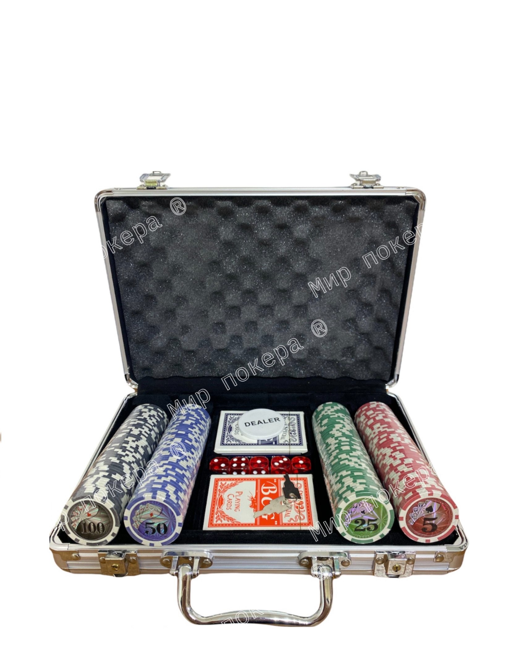 Покер в металлическом кейсе (карты 2 колоды, фишки 300 шт. б/номинала, 5 кубиков), 20.5х38 см