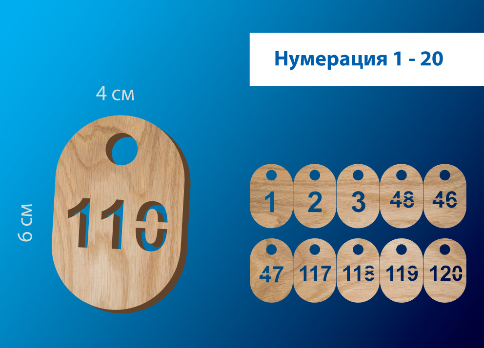 Номерки гардеробные от 1 до 20 / Форма "овал" / ушко 10 мм / фанера 3 мм