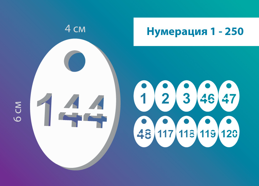 Номерки гардеробные от 1 до 250 / Форма "яйцо" / ушко 10 мм / молочный акрил 3 мм