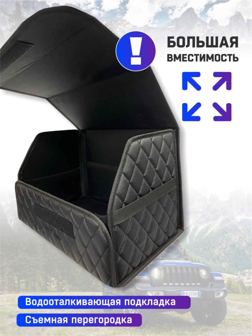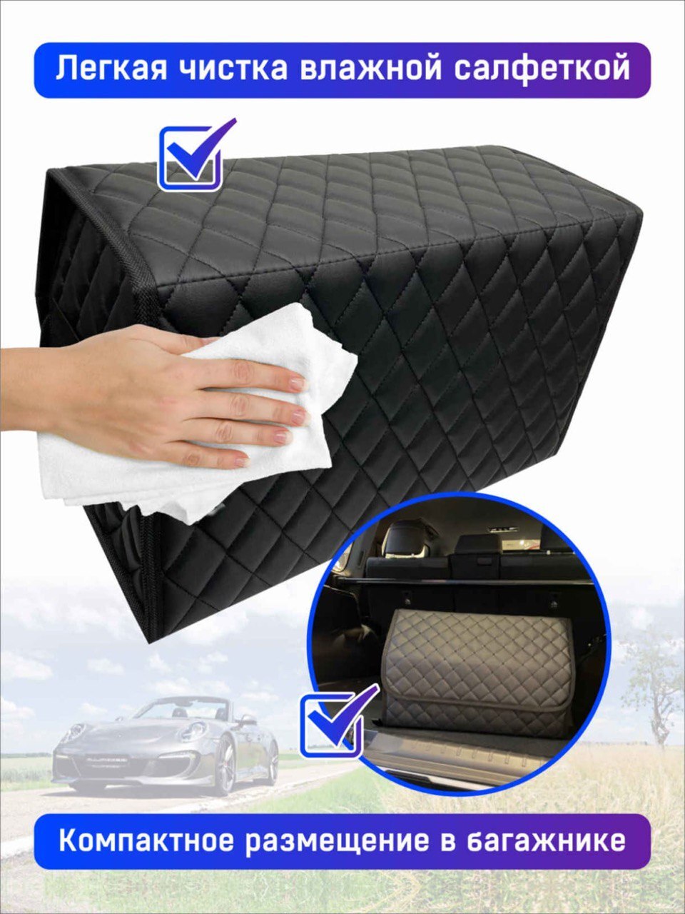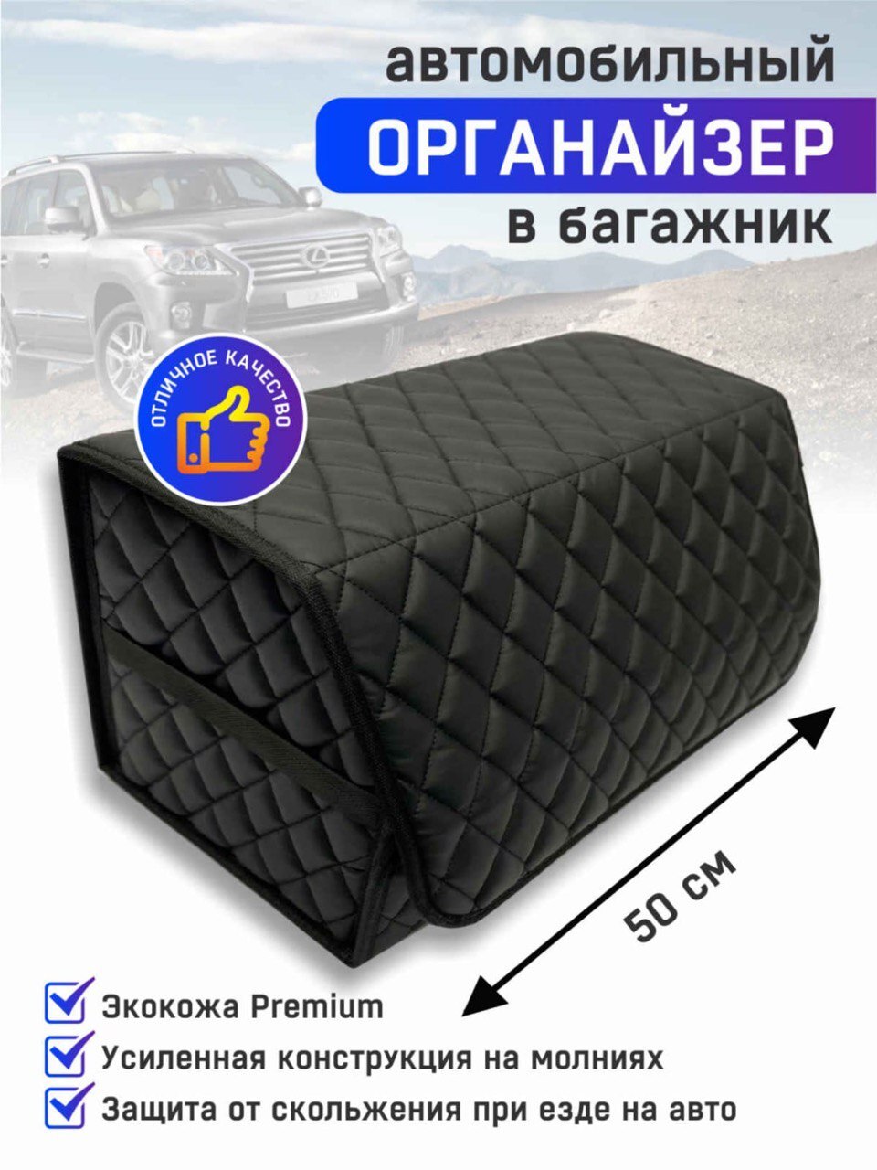 Саквояж (сумка, органайзер) в багажник из экокожи 55 см Чёрный с чёрной строчкой и чёрным кантом