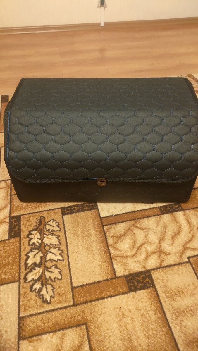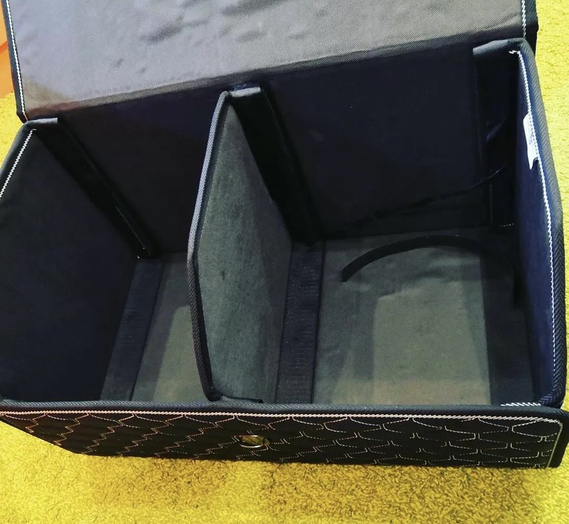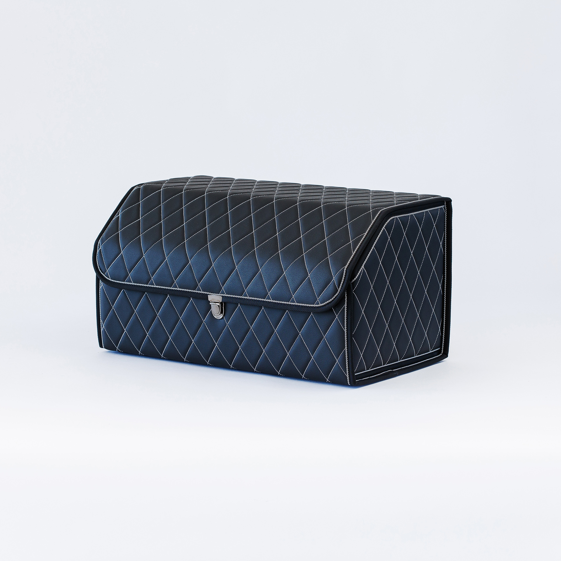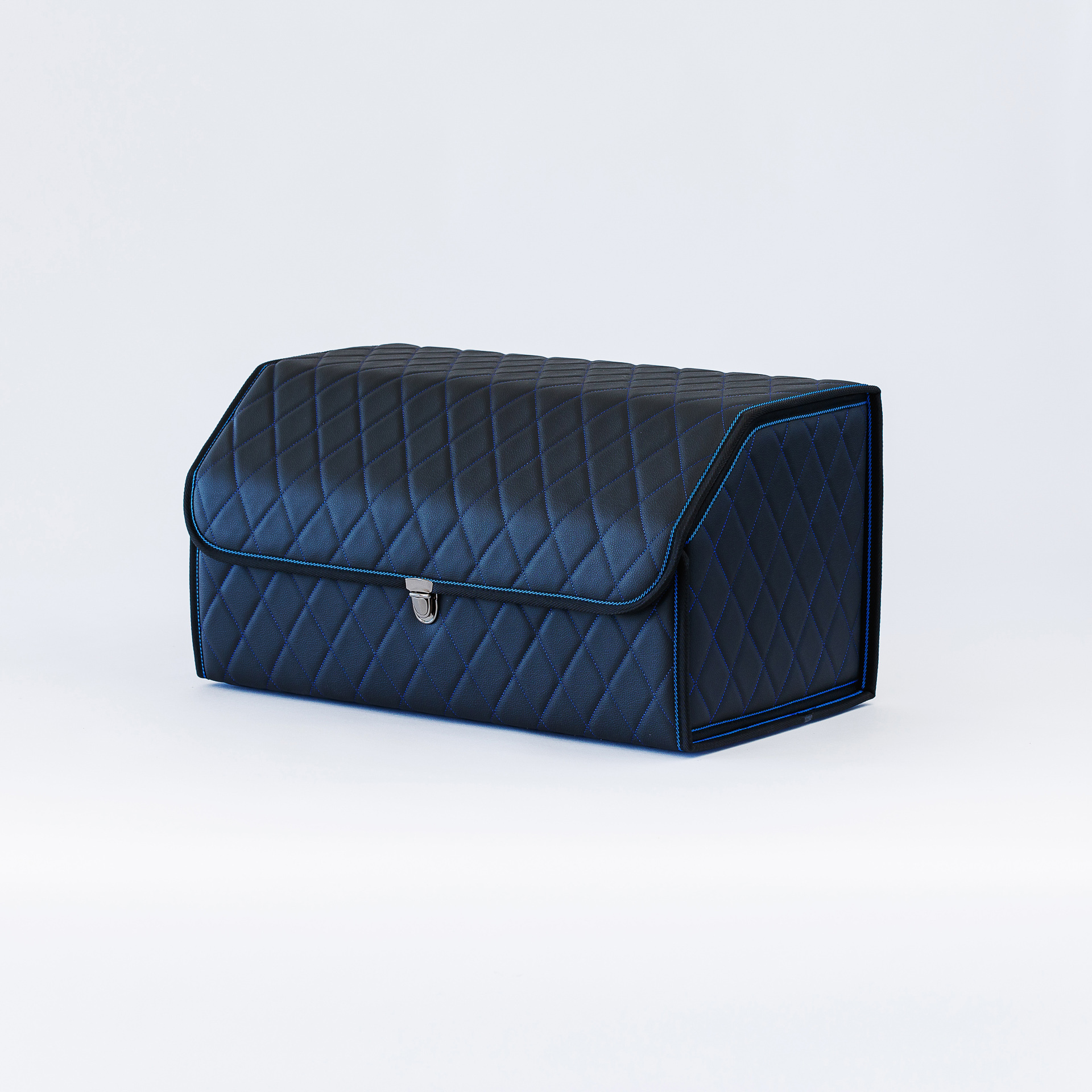 Саквояж (сумка, органайзер) в багажник из экокожи 55 см Чёрный с синей строчкой и чёрным кантом